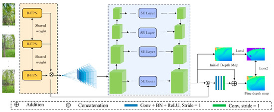 In the first stage, B-FPN is employed to replace the conventional convolutional neural network (CNN) backbone, enabling efficient multi-scale feature extraction and fusion. Its multi-path fusion mechanism enhances the network’s capacity to capture texture information at various scales, making it well-suited for modeling the complex multi-scale structures typically found in forest environments. Following feature extraction, a differentiable homography warping module aligns the extracted features from multiple views to a common reference frame, ensuring effective cross-view comparison and matching within a unified coordinate system. During the cost volume regularization stage, an SE (squeeze-and-excitation) attention module is incorporated to enhance the model’s ability to selectively emphasize informative features. The SE module adaptively recalibrates channel-wise feature responses, thereby improving cost volume regularization accuracy and suppressing the influence of irrelevant or redundant cues. Upon completing cost volume regularization, depth maps are estimated based on the optimized volume. A multi-scale depth regression strategy is adopted to produce fine-grained, high-precision depth maps, thereby offering robust data support for subsequent single-tree parameter extraction.