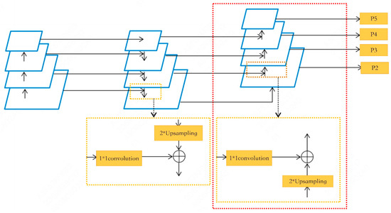 In forest environments, the coexistence of coarse tree trunks and fine-grained foliage poses significant challenges for conventional algorithms, which often fail to capture both large-scale structures and fine details simultaneously—leading to fragmented or distorted reconstruction outputs. Traditional Feature Pyramid Networks (FPNs), which rely on a top-down hierarchical structure, often encounter difficulties in concurrently capturing global semantic context and fine-grained spatial details. This limitation becomes especially pronounced in forest scenes, where regions such as shaded tree trunks exhibit low texture, and uneven lighting conditions—such as sunlight filtering through the canopy—further degrade feature consistency and hinder accurate cross-scale representation [32]. To overcome these challenges, we integrate a B-FPN, which enhances the conventional FPN by introducing a bottom-up information pathway alongside the existing top-down flow. This bidirectional design facilitates synergistic interactions between high-level semantic representations and low-level spatial features, thereby substantially improving the network’s ability to encode multi-scale vegetation structures with greater precision and robustness. The B-FPN adopts a three-layer convolutional network as the backbone feature extractor, with each layer composed of a 3 × 3 convolution, batch normalization (BN), and ReLU activation. The overall architecture is illustrated in Figure 5. This hierarchical design progressively expands the receptive field, enabling the extraction of both low-level edge textures and high-level semantic representations. BN alleviates feature distribution shifts caused by uneven illumination within forest scenes, while ReLU activation ensures stable gradient propagation throughout the deep network. Upon base feature extraction, a multi-scale feature pyramid {P5, P4, P3, P2} is constructed, with spatial resolutions increasing progressively from 1/32 to 1/4. Feature fusion is conducted via a bi-directional interaction strategy. In the top-down pathway, high-level features are bilinearly upsampled and fused with lower-level features through element-wise addition. Concurrently, the bottom-up pathway transmits fine-grained spatial details to upper layers via 3 × 3 convolution-based downsampling. This bi-directional fusion enables high-level semantic information to guide the refinement of lower-layer features, while low-level spatial cues enhance the localization accuracy of high-level representations. After each fusion stage, a 1 × 1 convolution is applied to enhance the representation capacity of the merged features. The final multi-scale outputs offer enriched representations of forest vegetation structures across varying scales.