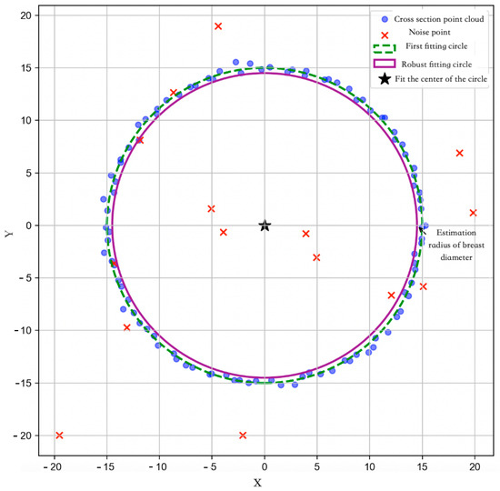 A 2D projection is applied to the extracted cross-sectional points, and a circle model is fitted using the least squares method to estimate the center coordinates and radius. The fitting objective function is formulated as follows:
