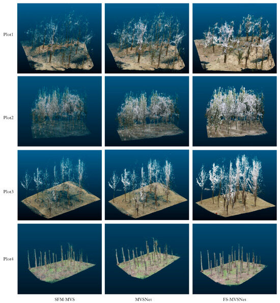 With respect to reconstruction time, the traditional SfM-MVS method exhibited the shortest processing duration (5.5–7 h across plots 1–4), primarily owing to its lower algorithmic complexity. In contrast, deep learning-based methods such as MVSNet and FS-MVSNet incurred longer runtimes as a result of their computationally intensive architectures. Specifically, MVSNet required 8.0–9.5 h, and FS-MVSNet 8.5–10.0 h across all test plots. Although FS-MVSNet introduces a modest increase in computational overhead, the trade-off is justified by substantial gains in point cloud density and reconstruction fidelity. The method thus remains practically viable for large-scale forest reconstruction tasks. These results indicate that FS-MVSNet achieves an effective balance between algorithmic performance and computational expense. Overall, the performance advantages of FS-MVSNet clearly outweigh the marginal computational cost, reinforcing its applicability in real-world forest scenarios.
