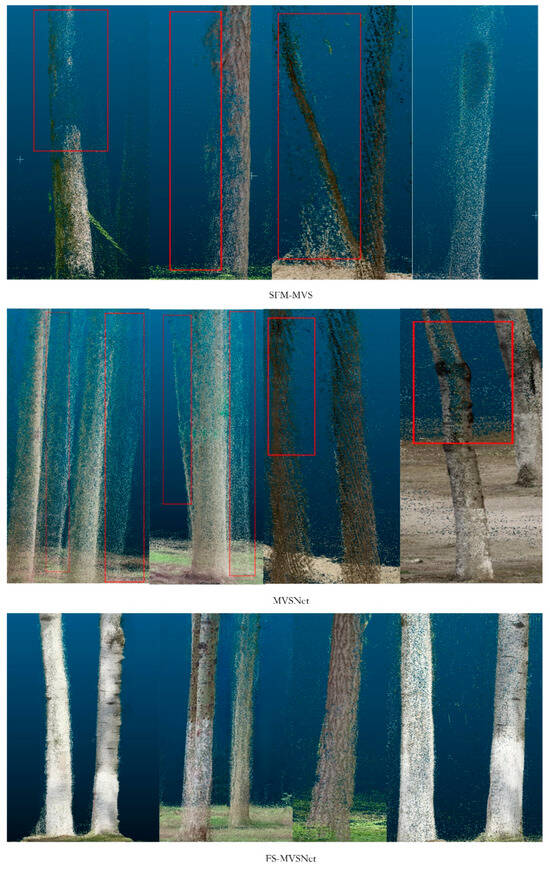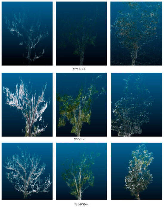 The canopy structure, characterized by its complex geometry and fine-grained branches and leaves, presents one of the major challenges in forest 3D reconstruction [38]. Figure 10 compares the canopy reconstruction results achieved by the three methods. The SfM-MVS method produced sparse and disordered reconstructions in the canopy regions. Most fine details of branches and leaves were missing, and the resulting point clouds exhibited significant fragmentation and discontinuities, failing to accurately reconstruct the intricate structures of the canopy. Given the structural complexity and severe occlusions in the canopy, the limitations of SfM-MVS were particularly evident, rendering it insufficient for capturing detailed canopy structures. The MVSNet method showed some improvements in canopy reconstruction, with relatively higher point cloud density and a rough presentation of major branch structures. However, significant noise, structural blurring, and local disorganization persisted. The fine structures of branches and leaves remained unclear, and the overall detail level was insufficient to accurately represent the geometric features and spatial relationships of the canopy. In contrast, the proposed FS-MVSNet achieved superior performance in canopy reconstruction. The reconstructed canopy point clouds were dense and finely detailed, with distinguishable branch and leaf structures. The branches appeared complete and naturally shaped, and both the overall canopy contours and local structures were well recovered. Even the intricate interwoven features of fine branches and leaves were effectively reconstructed, demonstrating significantly higher completeness. These results further validate that the feature pyramid module effectively captures multi-scale structural features within the canopy, while the attention mechanism enhances the representation of local fine details in key regions.