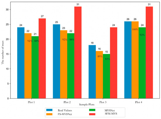 The bar chart in Figure 11 presents a comparative analysis of reconstructed versus ground-truth tree counts across four experimental plots, using different reconstruction algorithms. Each color in the chart corresponds to a distinct reconstruction method. The blue bars indicate the ground-truth tree counts, orange represents our proposed method, green corresponds to MVSNet, and red denotes SfM-MVS. The SfM-MVS algorithm exhibited substantial overestimation, frequently misinterpreting individual trees as multiple instances. MVSNet consistently produced lower tree counts compared to our method, with a pronounced underestimation observed in Plot 3. Across all four plots, our method yielded the most accurate reconstructions, achieving tree count recovery rates of 92%, 92%, 89%, and 100%, respectively. Notably, in Plots 3 and 4, our approach outperformed MVSNet, achieving reconstruction rate gains of 7% and 8%, respectively.