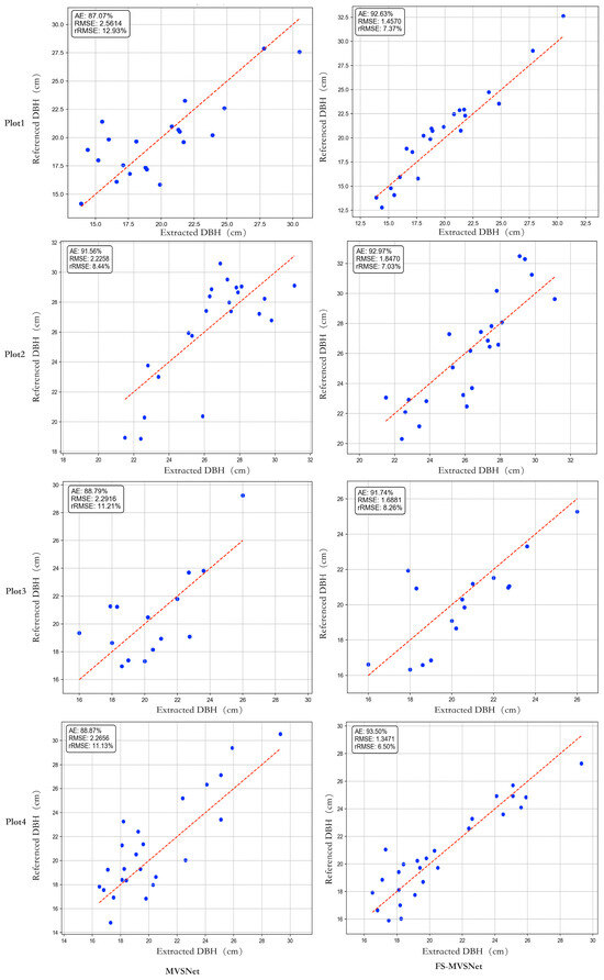 Finally, the DBH was estimated for each segmented individual tree. DBH serves as a critical metric for assessing tree growth dynamics and overall physiological health [39]. Owing to the low-density point clouds produced by the SfM-MVS pipeline, reliable DBH estimation could not be achieved. Therefore, we conducted a comparative analysis of DBH estimation accuracy between MVSNet and FS-MVSNet across multiple forest plots.
