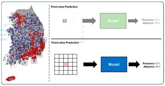 Point-wise prediction and patch-wise prediction. Point-wise prediction considers only the local geographical and meteorological features, which may neglect spatial dependencies. In contrast, patch-wise prediction can incorporate the surrounding area’s context, capturing broader environmental factors that influence PWD occurrence.