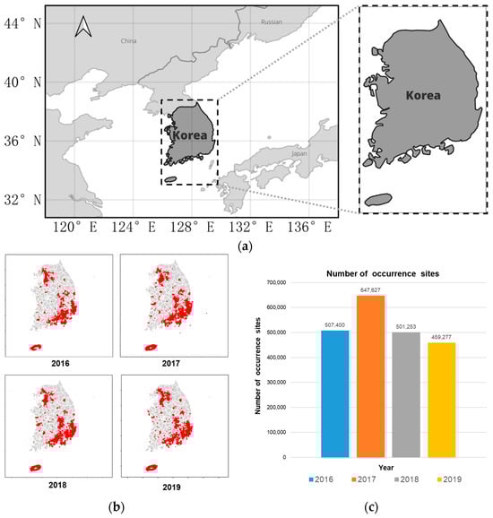 The area of interest in our research includes the whole of South Korea, as shown in Figure 2a. We primarily referred to the data collection methodology and structure outlined in work [] to collect the data. Specifically, we obtained maps from the Forest Big Data Exchange Platform [] that show the locations of PWD occurrences in South Korea from 2016 to 2019, like Figure 2b. The locations of occurrence for each year are not consistent; some locations are added or neglected through the years between 2016 and 2019 so that it is hard to directly apply the CA–Markov model. That is why the number of occurrences sites of each year from 2016 to 2019 are pretty different, as in Figure 2c, although PWD occurrence would be consistently increased.