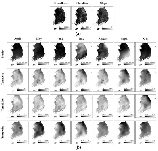 The previous research [] used seven environmental features, including geographical features (elevation, slope, and distance to roads) and meteorological features (annual mean temperature, minimum temperature in January, maximum temperature in July, and annual precipitation), to create datasets and models. In our study, we retained three geographical features and modified the meteorological features. As the peak activity period for Bursaphelenchus xylophilus (the causative agent of PWD) [] spans from April to October, we used all the meteorological data (mean temperature, minimum temperature, maximum temperature, and precipitation) recorded during this period, instead of the four features mentioned above. We obtained this environmental feature data from the period 2016 to 2019, with a spatial resolution of 30 m by 30 m and raster dimensions of 17,511 by 20,362 pixels, as shown in Table 1. Figure 3 illustrates examples of environmental features. Figure 3a shows the maps of selected geographical features and the distribution of the “DistoRoad,” “Elevation,” and “Slope” features, with scale bars. Figure 3b also represents the maps of several meteorological features, the distribution of precipitation, mean temperature, maximum temperature, and minimum temperature for each month from April to October, with scale bars. Elevation and slope data were sourced from the National Geographic Information Institute of Korea []. The distance to roads refers to the proximity to public roads, calculated by integrating road data from the National Spatial Data Infrastructure Portal [] and the Intelligent Transport Systems of Standard Node Link []. Meteorological data were collected from the Climate Information Portal of the Korea Meteorological Administration [].