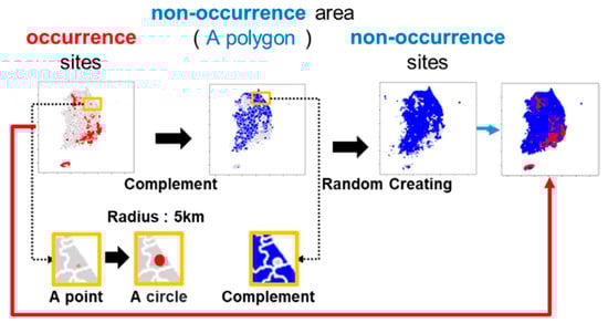Non-occurrence site generation. The “red area” indicates the PWD occurrence area, and the “blue area” indicates the PWD non-occurrence area. Non-occurrence sites were generated 5 km away from occurrence sites, with an equal number of randomly selected sites exhibiting very low relative occurrence probabilities. Geographical and meteorological features were extracted using the coordinates of both occurrence and non-occurrence sites.