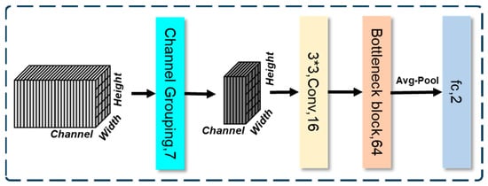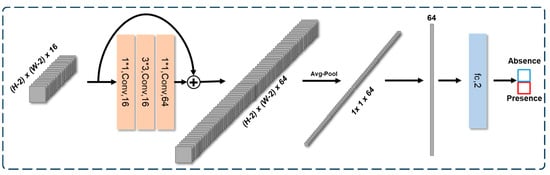 The basic modules in ResNet [], each ResNet block, consists of two to three convolutional layers and incorporates a shortcut connection that directly adds the input to the output. By directly propagating the input signal, this structure includes a residual connection (skip connection), which mitigates information degradation between layers and thereby enhances the learning capability of deeper networks. This architecture facilitates easier training and enables the construction of deeper networks more effectively. In ResNet, the common types of blocks include the basic residual block and the bottleneck block. Although the bottleneck block employs 1 × 1 convolutions to reduce and then restore the number of channels, primarily to lower computational cost, and is generally designed for deeper networks, which may seem unsuitable for a shallow network like ours, we adopt the bottleneck block (orange block in Figure 9) in our method. This is because, in practice, 1 × 1 convolutions are also commonly used to capture complex channel-wise relationships [], similar to their role in the previously introduced Channel Grouping block. Therefore, during this stage of feature extraction, the model can be regarded as performing a form of implicit Channel Grouping without any prior knowledge introduced by us. The shape of the features after the bottleneck block is (H-2, W-2, 64). Following the conventional approach of CNN classification models [], an average pooling layer and a fully connected (FC) layer are applied for classification. The softmax output of the FC layer produces the probability of occurrence(presence) and non-occurrence(absence).
