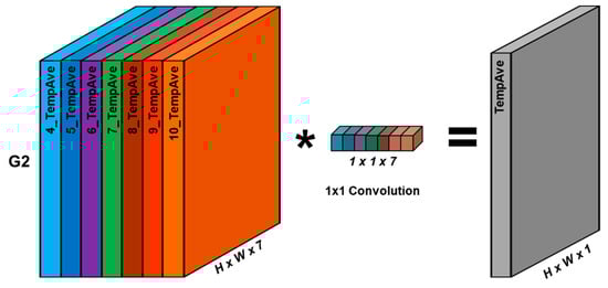An example of channel grouping for TempAve (G2). Here, seven features are automatically weighted as shown in different colors and aggregated 1 × 1 convolution in Figure 6 by training.