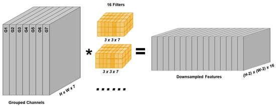 In the ResNet [] architecture, there are typically several convolutional layers at the head, referred to as the “stem.” Their primary function is to perform initial feature extraction and downsampling on the input, providing more compact and representative features for subsequent deeper network modules. In our method, we also performed downsampling after channel grouping, as in Figure 8. However, compared to the original ResNet, since our input has a relatively low resolution unlike the image classifiers [], we used only a single convolutional layer with 16 filters of size 3 × 3. The shape of the features after downsampling is (H-2, W-2, 16).