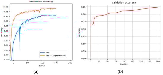 Validation accuracy of CNN model (a) and Logistic Regression model (b). The CNN training process with the augmented dataset showed better efficiency from the beginning, and the final accuracy was also higher compared to the non-augmented dataset.