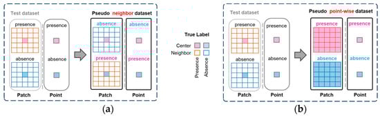 Pseudo test datasets: (a) Pseudo neighbor dataset; the meteorological values of the central location were randomly swapped between occurrence and non-occurrence samples, with labels unchanged. (b) Pseudo point-wise dataset; the values from a specific location were replicated across neighboring areas to simulate a point-wise scenario.