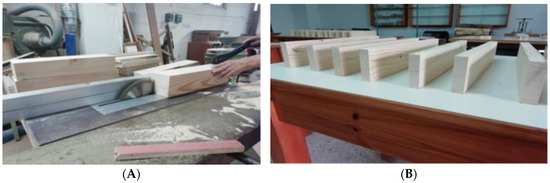 For the purposes of the current experimental work, two trunks of fir species (Abies Borisii-regis L.) were harvested from the University Forest of Pertouli (Trikala), located in the eastern part of Pindos (Central Greece). The trunks were transferred to lab infrastructures and were cut and formed into sawn pieces (Figure 1A) of specific dimensions of 390 mm in length, 75 mm in width, and 20 mm in thickness (Figure 1B). The EMC (ISO13061-1:2014 [38]) and the basic density (dry wood weight/wet wood volume, ISO13061-2:2014 [39]) of all the samples were determined, using 5 replicates per property test, from which the mean values and standard deviation values were based. The mean EMC value of the fir wood was measured to be 11.52% (standard deviation—SD: 0.06), while the density of the wood was found to be 446 kg/m3 (SD: 81).