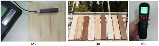 After the time of board anchoring, 9 different measurements were carried out on 9 different days, with a total duration of 6 months. On each of the board’s surfaces (front and back), measurements of temperature were conducted at 5 different points of each of the surface areas every two hours (12 h measurement). The measurements were carried out using a digital infrared thermometer with a digital LAZER (Parkside, Lidl Stiftung & Co., Neckarsulm, Germany) (accuracy of ±0.2 °C), keeping a stable distance from the wooden boards, according to EN 60825-1:2014 [46] (Figure 2C).