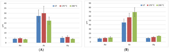The mean values of the surface roughness indices (Ra, Rz, and Rq) before (untreated—UT) and after thermal treatment application (treated at 170 °C and 200 °C) (A), and the mean values of the surface roughness indices of the specimens after 6 months of exposure outdoors (B).