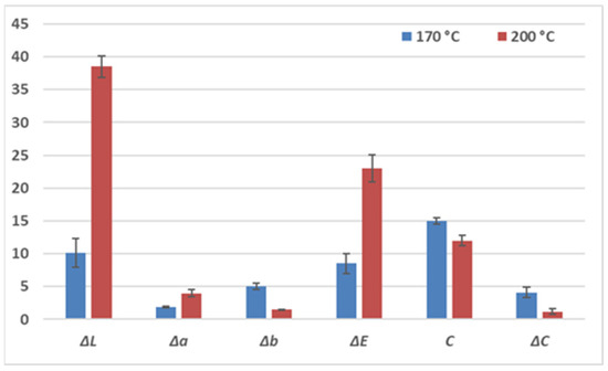 It was observed that as the intensity of the treatment (temperature level) increased, the lightness (L* index) decreased, depicting the darkening of the wood’s surface. According to the results, a decrease in L* was observed already in the mildest treatment at 170 °C compared to the reference material. In comparison, this decrease became more pronounced in the samples treated at 200 °C. This fact indicates the significant influence of treatment temperature on the lightness of the wood specimens. In parallel, it was observed that the value of color index a* tended to increase due to thermal treatments without marking high standard deviation values. Similarly, index b* exhibited similar values among the two different treatment values.
