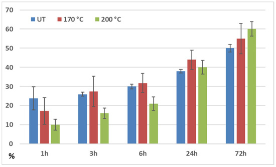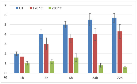 Nevertheless, the thermally modified boards demonstrate a higher rate of weight regain during the conditioning process after thermal treatment compared to the untreated specimens. Essentially, the moisture uptake trend of the modified wood specimens was found to be higher compared to that of the untreated ones. Additionally, a significant difference was detected between the two categories of thermally modified wood (170 °C and 200 °C). More specifically, the samples modified at 170 °C presented lower weight regain during the conditioning process compared to the modified ones at 200 °C. This indicates a higher trend of wood to balance its moisture content according to the current relative humidity. The thermally treated wood’s high permeability [37,51] is a factor that could have an association with faster moisture uptake.