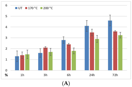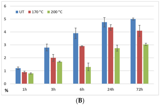 A similar trend of the longitudinal swelling of treated and untreated wood specimens was observed in the tangential (Figure 7A) and radial swelling trends (Figure 7B). The tangential swelling, as well as the radial swelling of thermally treated wood, were found to be much lower than the respective mean values of untreated (reference) wood specimens, marking, in most cases, statistically significant differences. The numerical indices increased substantially at 24 h and 72 h of immersion in water, as was expected. Among the samples of the two treatments, in those that were thermally modified at 200 °C, the tangential and radial swellings were even lower compared to the samples modified at 170 °C. These findings were further evidence of the beneficial influence of thermal treatments on wood material properties. As was expected, the radial swelling values were, in general, found to be lower than the respective values of tangential swelling due to the anatomical characteristics of wood.