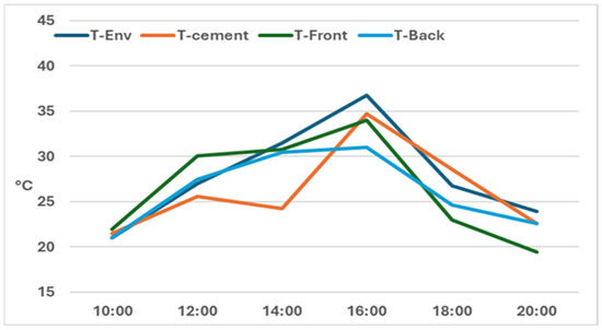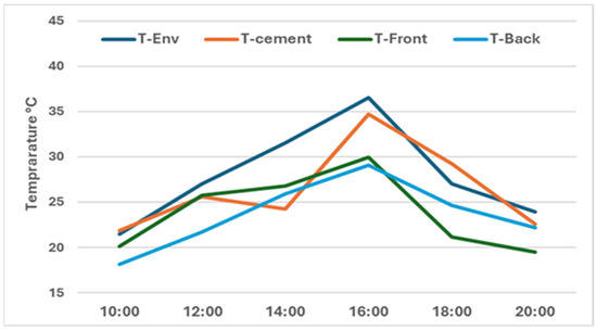 The temperature of the untreated specimens (reference) exposed outdoors during the winter month of February. (T-Env.: temperature of the environment; T-cement: temperature of the reference material of cement wall; T-Front: temperature on the front specimens’ surface; T-Back: temperature on the back specimens’ surface).