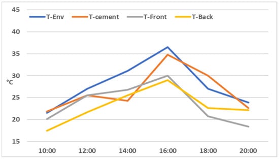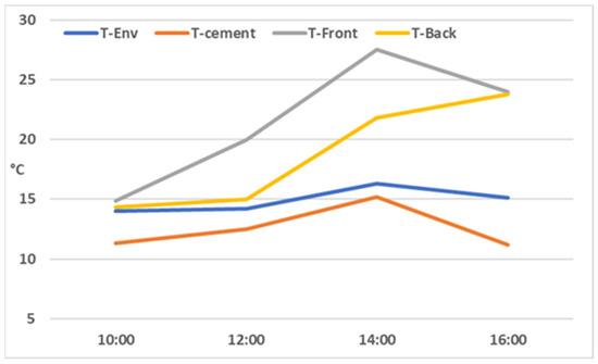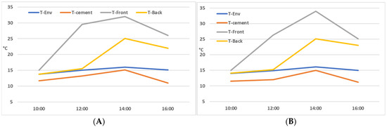 The temperature values of the back surfaces that do not have direct contact with solar irradiation were maintained low. Comparing the front and back surfaces, a large difference at a level between 10 and 6 °C was identified. This indicates that between the hours of 12:00 and 14:00, the temperature transfer was quite slow. A fact that changes from 16:00 onwards, though without major differences (Figure 12B).