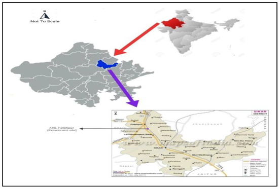 The present study was carried out at the Agriculture Research Station, Fatehpur, Sri Karan Narendra Agriculture University Agriculture University, Jobner, situated in village Harsava of Fatehpur Tehsil in Sikar district of Rajasthan (27°56′11.2′′ N latitude and 74°58′50.0′′ E longitude) (Figure 1). The study was conducted as part of the All India Coordinated Research Project (AICRP) on Agroforestry, featuring different tree-based agroforestry systems arranged in a randomized block design (RBD) block plantation. The research station is situated in the IIA agro-climatic zone of Rajasthan, known as the “Transitional Plain of Inland Drainage”, which receives an average annual rainfall of 300–500 mm. The temperature in this region is highly variable, dipping below the freezing point (up to −2.5 °C) during the winter and soaring to as high as 52 °C during the summer.