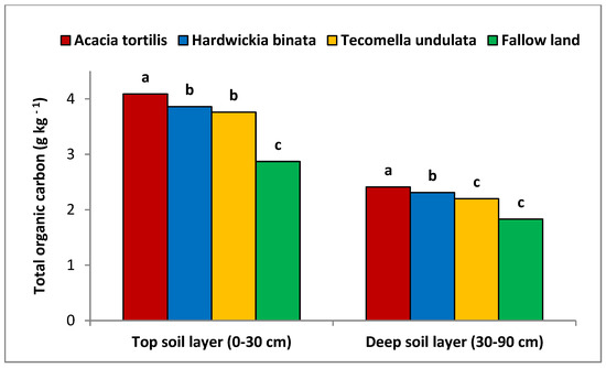 The distribution of TOC content across various agroforestry systems and fallow land (0–90 cm) is summarized in Figure 3. Results indicate that all tree-based agroforestry systems contained higher TOC accumulation in surface layers, with concentration decreasing with increasing soil depth. In the top soil layers (0–30 cm depth), the Acacia tortilis-based agroforestry system demonstrated the highest TOC concentration (4.09 g kg−1), followed by the Hardwickia binata-based agroforestry system (3.85 g kg−1), the Tecomella undulata-based agroforestry system (3.75 g kg−1), and fallow land (2.87 g kg−1). Therefore, the Acacia tortilis-based system had 5.6% and 29.8% higher TOC than the Hardwickia binata-based agroforestry system and fallow land, respectively. In deep layers (30–90 cm), similar trends were observed.