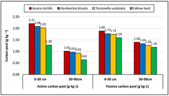 The data pertaining to active carbon pool and passive carbon pool of different agroforestry systems and fallow land in different soil depths are presented in Figure 4. Among agroforestry systems, the maximum active carbon pool at the top soil layer (0–30 cm) was observed for the Acacia tortilis-based agroforestry system (2.21 g kg−1) followed by the Hardwickia binata-based agroforestry system (2.08 g kg−1), Tecomella undulata-based agroforestry system (2.02 g kg−1), and fallow land (1.28 g kg−1). Similarly, the highest passive carbon pool was observed for the Acacia tortilis-based agroforestry system, and the lowest was observed for fallow land. The ACP was increased by 68.3%, 59%, and 53.6% for Acacia tortilis-, Hardwickia binata-, and Tecomella undulata-based agroforestry systems, respectively, compared with fallow land (Table 3). The PCP was increased by 18.4%, 11.8%, and 8.2% for Acacia tortilis-, Hardwickia binata-, and Tecomella undulata-based agroforestry systems, respectively, compared with fallow land at the top soil layer (0–30 cm). At the deep soil layers (30–90 cm), a similar trend was also observed for both the ACP and PCP (Figure 4).