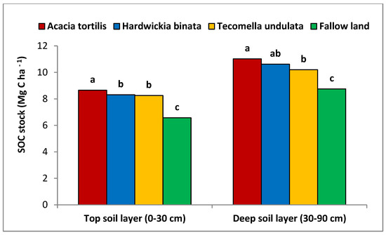 Soil organic carbon stock in the soil profile (up to 90 cm depth) was highest in the Acacia tortilis-based agroforestry system (39.34 Mg C ha−1) and the least in fallow land (30.65 Mg C ha−1) (Figure 5). The SOC stock was significantly higher in deeper layers and across all the agroforestry systems compared to fallow land. At the top soil layer (0–30 cm), the Acacia tortilis-based agroforestry system registered an increase of 31.7%, the Hardwickia binata-based agroforestry system registered an increase of 26.5%, and the Tecomella undulata-based agroforestry system registered an increase of 25.7% compared with fallow land. However, at the deeper soil layer (30–90 cm), the Acacia tortilis-based agroforestry system registered an increase of 67.7%, the Hardwickia binata-based agroforestry system registered an increase of 61.6%, and the Tecomella undulata-based agroforestry system registered an increase of 55.8% over fallow land. Thus, agroforestry systems accumulated higher SOC stock at the deeper layers compared to top layers. The soil organic carbon stock distribution in the different tree-based agroforestry systems was of the following order: Acacia tortilis-based agroforestry system > Hardwickia binata-based agroforestry system > Tecomella undulata-based agroforestry system > fallow land.