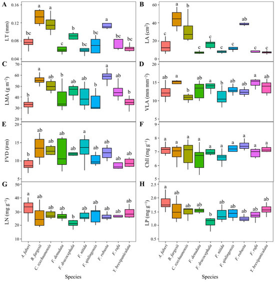 Variance analysis of leaf functional traits among SBS. Different lowercase letters indicate significant differences between SBS (α = 0.05). (A): LT: leaf thickness; (B) LA: leaf area; (C) LMA: leaf mass per area; (D) VLA: vein length per area; (E) FVD: fourth-order vein diameter; (F) Chll: chlorophyll concentration; (G) LN: leaf nitrogen concentration; (H) LP: leaf phosphorus concentration.
