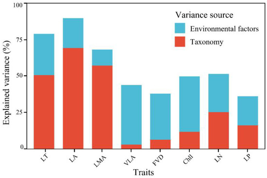 Variance decomposition of variation in leaf functional traits of 10 SBS based on LMM. LT: leaf thickness; LA: leaf area; LMA: leaf mass per area; VLA: vein length per area; FVD: fourth-order vein diameter; Chll: chlorophyll concentration; LN: leaf nitrogen concentration; LP: leaf phosphorus concentration.
