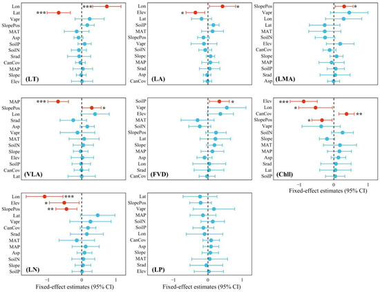Fixed effect estimate values of environmental factors for leaf functional trait variations (α = 0.05). Dots indicate effect values and short horizontal lines indicate confidence intervals; red color indicates that the effect of the environmental factor on the trait is significant (*** p < 0.001; ** p < 0.01; * p < 0.05); light blue color indicates that the effect of the environmental factor on the trait is not significant (p > 0.05). Lon: longitude; Lat: latitude; Vapr: vapor pressure; SlopePos: slope position; MAT: mean annual temperature; Asp: slope aspect; SoilP: soil phosphorus concentration; SoilN: soil nitrogen concentration; Srad: solar radiation; CanCov: canopy cover; MAP: mean annual temperature; Slope: slope; Elev: elevation.