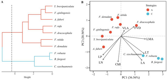 Hierarchical cluster analysis (A) and PCA (B) results of leaf functional traits among 10 SBS. (A) The dashed line indicates the optimal grouping tree height. (B) Dots represent bamboo species mean values. Red dots represent species with an acquisitive strategy (abbr. A) and light blue dots represent species with a conservative strategy (abbr. C). LT: leaf thickness; LA: leaf area; LMA: leaf mass per area; VLA: vein length per area; FVD: fourth-order vein diameter; Chll: chlorophyll concentration; LN: leaf nitrogen concentration; LP: leaf phosphorus concentration.