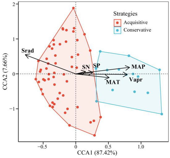 CCA ordination of trait-based strategies constrained by environmental factors. The shaded areas indicate the environmental distribution ranges of species with different strategy types. MAT: mean annual temperature; MAP: mean annual temperature; Vapr: vapor pressure; Srad: solar radiation; SoilP: soil phosphorus concentration; SoilN: soil nitrogen concentration.