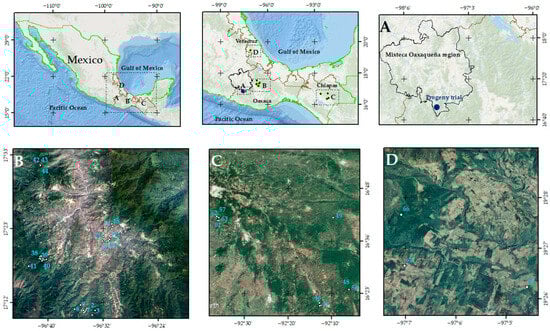 Location of the progeny trial (A) in the Mixteca Oaxaqueña region and location of superior trees of Apulco pine (Pinus pseudostrobus var. apulcensis) in Sierra Juárez (B), Sierra Madre de Chiapas (C), and Sierra Madre Oriental (D) regions (numbers correspond to the number of superior trees of the families listed in Table S1).