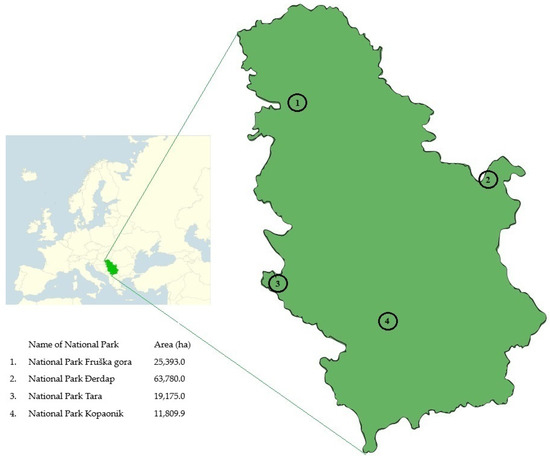 In Serbia, there are, in total, five NPs, and management of these NPs is overseen by five PEs [31]: PE NP Đerdap, PE NP Kopaonik, PE NP Tara, PE NP Fruška gora, and PE NP Šar planina (the PE NP “Šar planina” is located in the autonomous province of Kosovo and Metohija and due to the political situation is not part of this analysis) (Figure 1). The total area of NPs in Serbia amounts to 142,962.9 ha [89], which represents 1.6% of the total territory, or 17.3% of all PAs in Serbia [16]. The area of NPs remained unchanged between 2008 and 2022.