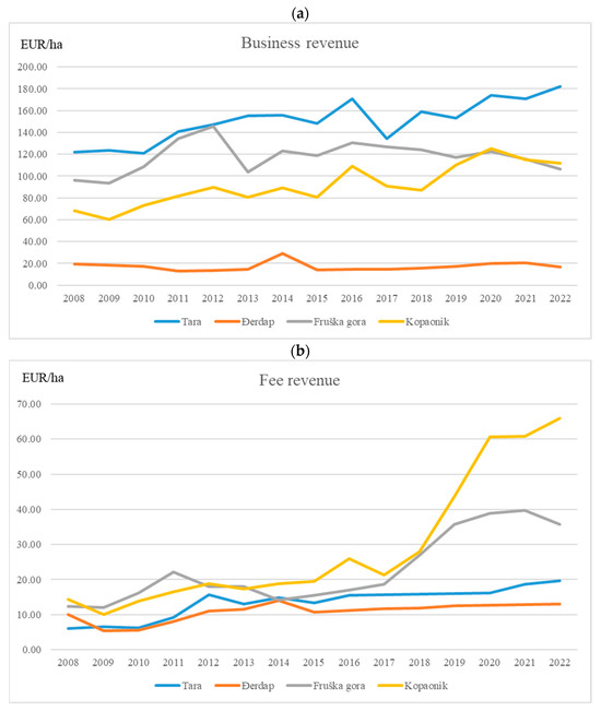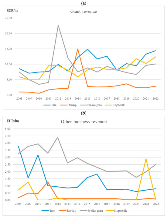 Using descriptive statistics, Figure 2 and Figure 3 show changes in revenues for period 2008–2022. The highest values per ha are present for business revenues, while the lowest values are present for other business revenues. Within business revenues (Figure 2a), NP Tara has the highest values (120.9 EUR/ha–181.9 EUR/ha), which is not the case with NP Đerdap (13.4 EUR/ha–20.4 EUR/ha). The best results for NP Tara are due to excellent forest habitats for wood production and a mixture of beech, fir, and spruce stands that produce high-value wood products. This is not the case with NP Đerdap, which has the lowest business revenues and a lack of good forest stands. Most of the stands in NP Đerdap represent either coppice forests or protective forests, which do not have good forest stands or cannot be used for sustainable forest management. Fee revenues (Figure 2b) follow business revenues, starting from 6.1 EUR/ha (NP Tara) up to 14.3 EUR/ha (NP Kopaonik). The highest values for fee revenues were obtained in 2022 within NP Kopaonik (65.9 EUR/ha), which is not the case with NP Đerdap (13.0 EUR/ha). The reasons for such huge differences in obtaining fee revenues lays in fact that NP Kopaonik developed effective and diversified methods of fee collection. These include the collection of fees from both individuals and companies as well as using online and terrestrial/field methods of collection that operate within the area of NP Kopaonik. This was especially evident in 2019–2020, when the online method of collection of fees was developed. An increase in fee revenue is not present for NP Đerdap, and one of the reasons could be the area that this NP covers (63,870.0 ha), which is the case with other NPs in Serbia.