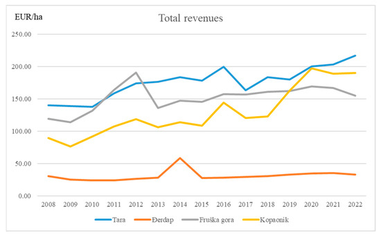 Looking at the total revenues (Figure 4), it can be observed that NP Tara constantly has the highest revenues per ha, followed by NP Fruška gora and NP Kopaonik, while NP Đerdap has the lowest revenues per ha. In NP Tara, the peak in 2016 and the decrease in 2017 are connected with better/lower wood production, which is the same for the peak for NP Fruška gora in 2012. From the other side, the peak in revenues (2016) in NP Kopaonik is connected with increase in business revenues and fee revenues, while the peak in 2020 is connected with a drastic increase in fee revenues. As stated before, the growth of total revenues (2014) in NP Đerdap for 2014 is connected with high revenues from donations, i.e., governmental revenues received for infrastructure development.