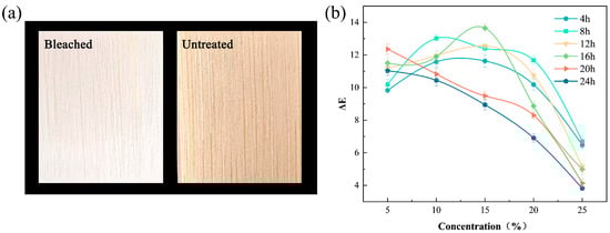 (a) Comparative digital photographs of bamboo specimens before and after the bleaching treatment (15% H2O2, 16 h). (b) Dependence of color-difference values on the H2O2 concentration ( indicates the total color difference relative to untreated controls).