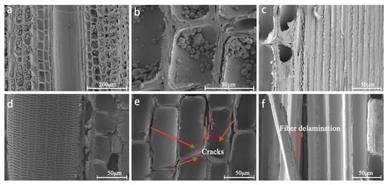 Figure 2 illustrates the comparative scanning SEM images of bamboo specimens before and after the bleaching treatment. In unbleached specimens (Figure 2a–c), parenchyma cell lumens were densely packed with cytoplasmic inclusions, exhibiting a compact cellular arrangement with minimal intercellular fissures, while bamboo fibers displayed well-aligned architectures. Post-bleaching observations (Figure 2d–f) revealed substantial dissolution of luminal deposits (e.g., protein bodies, starch granules), resulting in smoothened vessel surfaces and significantly depleted intracellular contents. Notably, distinct intercellular delamination was observed between parenchyma cells (Figure 2e). Fibrous cells demonstrated partial structural collapse, concomitant with increased porosity and expanded pore morphology, which may have facilitated enhanced liquid permeability. These ultrastructural modifications are principally attributable to the H2O2-induced degradation of lignin and hemicellulose—key structural components in bamboo cell walls.