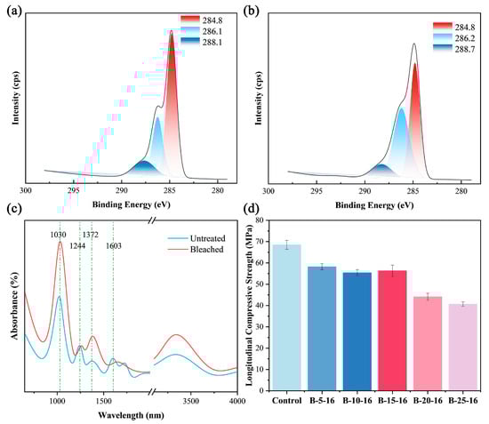 Narrow spectrum of C1s in bamboo: (a) untreated; (b) bleach treatment (15% H2O2, 16 h). (c) FTIR spectra of untreated bamboo and bleached bamboo (15% H2O2, 16 h). (d) Longitudinal compressive strength of bamboo (B-5-16 denotes a 5% bleaching concentration with a 16-h duration).