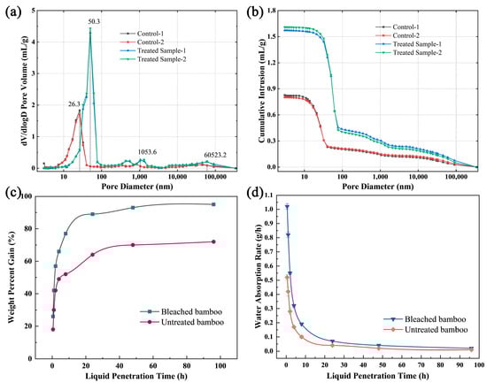 (a) Log differential intrusion and (b) cumulative intrusion versus pore diameter of bamboo; (c) weight percent gain and (d) water absorption rate of bamboo versus infiltration time.