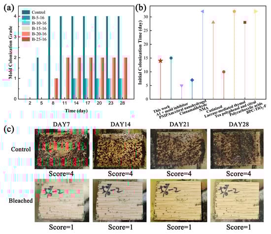 (a) Mold colonization grades of the bamboo specimens before and after the bleaching treatment. (b) Time to initial colonization of bleached bamboo compared with chemical preservation methods from previous studies [3,4,6,35,36,37,38,39,40]. (c) Mold resistance performance of the bleached bamboo specimens.