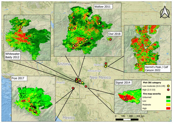 Map of fire locations, names, and year of burn showing perimeters and soil burn severity, overlaid with burned plot locations and composite burn index (CBI), which is an in situ index of burn severity category [54]. Geodata from Rapid Assessment of Vegetation Condition after Wildfire and Monitoring Trends in Burn Severity [56,57].