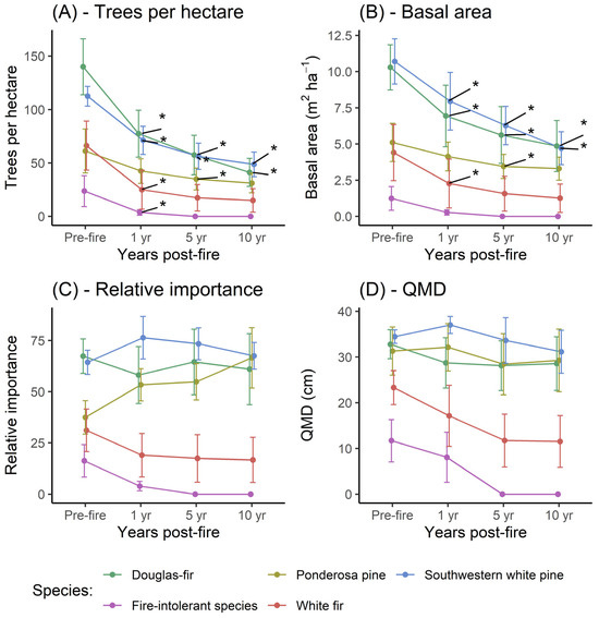Changes through time in (A) live trees ha−1 (TPH), (B) basal area (BA; m2 ha−1), (C) relative importance, and (D) quadratic mean diameter (QMD; cm) over time, by species or species group on low–moderate severity plots in the Wallow and Signal Mountain fires (n = 8). Relative importance is an index combining proportionate BA and TPH of a species relative to other species in a stand. Significant changes (p < 0.05) in BA, TPH, relative importance, and QMD were identified in all species at each measurement year compared to previous measurement year values using a WCX test and are denoted by an asterisk (*). Error bars represent the standard error of the mean.