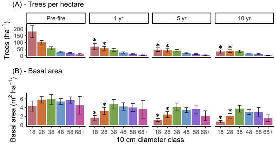 Overstory diameter distributions over time on low–moderate severity plots in the Wallow and Signal Mountain Fires (n = 8 plots). Significant (p < 0.05) changes in (A) TPH (trees ha−1) and (B) BA (basal area; m2 ha−1) from prior measurement years were identified with a WCX test and are denoted by an asterisk (*). Significant differences in the overall diameter distribution were tested with a K-S test and found to be significant (p < 0.01) 1-year post-fire, but not in subsequent years. Error bars represent the standard error of the mean.
