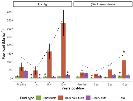 Changes in fuel loading (Mg ha−1) over time and fuel type for (A) high severity and (B) low–moderate severity plots. Significant changes (p < 0.05) from the previous measurement year for each fuel type were identified using a WCX test and are denoted by an asterisk (*). Total fuel load is represented by a dotted line. Significant changes in total fuel load were identified from pre-fire using a WCX test at y1 and between post-fire years using the mixed-effects fuel load model. Changes were significant between all post-fire years and between pre-fire and y10 on high severity plots, and not significant on L-M severity plots. Error bars represent the standard error of the mean. For definition of fuel types, see Methods.
