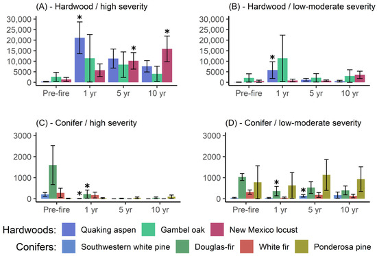 Changes in average regeneration densities (trees ha−1) over time in the Wallow and Signal Mountain Fires. Plots represent hardwoods in (A) high and (B) low–moderate severity, and conifers in (C) high and (D) low–moderate severity. Significant changes (p < 0.05) in understory trees density were identified from pre-fire using the WCX test at y1 and between post-fire years using the mixed-effects conifer and hardwood regeneration models, and they are denoted by an asterisk (*). Note the differences in y-axis scale between plots (A,B) and (C,D). Error bars represent the standard error of the mean.