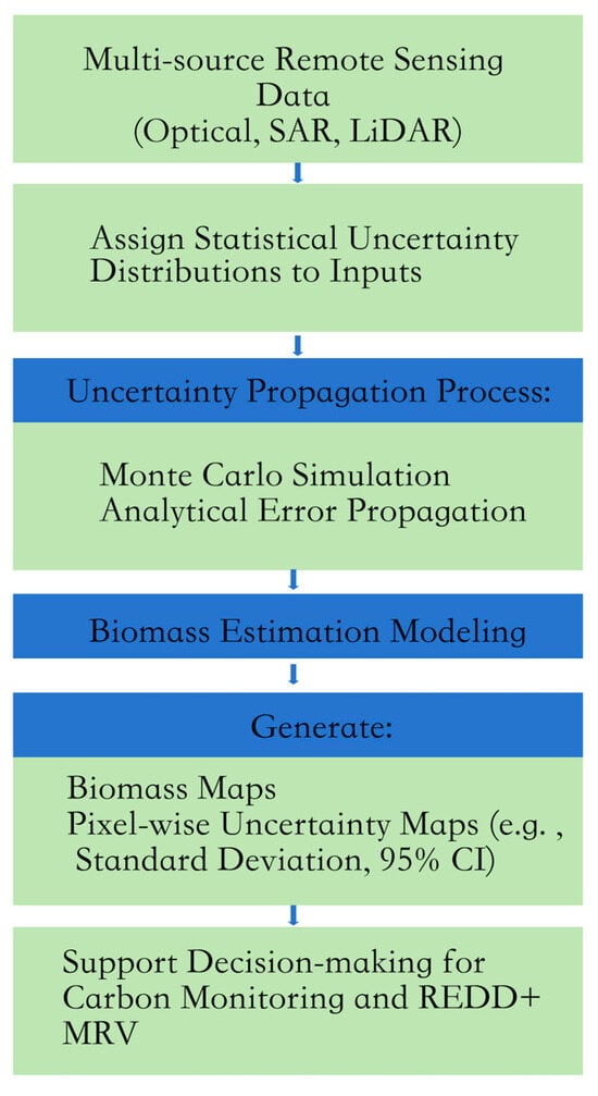 Figure 3 shows the schematic workflow for uncertainty propagation in multi-source forest biomass estimation. Multiple sensor datasets are assigned uncertainty distributions, propagated through biomass estimation models using Monte Carlo simulation or analytical error modeling, resulting in biomass and uncertainty maps for decision-making support. Recent studies illustrate this approach. Ometto et al. (2023) [43] combined GEDI height metrics and Sentinel-1 backscatter using MCS to produce biomass maps with spatially variable confidence intervals across the Brazilian Amazon. These uncertainty-aware products are increasingly required by REDD+ MRV systems and carbon markets, where overconfident estimates carry financial and legal risks.