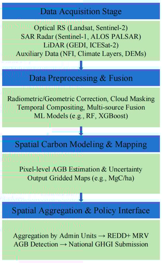 In addition, ancillary geospatial layers, including land cover maps, climate variables, topography, and soil properties, serve as essential covariates in statistical and process-based carbon models [27,39]. Socioeconomic and infrastructure data further inform spatial drivers of deforestation and carbon flux. These heterogeneous datasets are integrated in GIS platforms to support model stratification, spatial alignment, and uncertainty assessment [40,41,42], thereby enabling robust, policy-relevant carbon accounting systems.