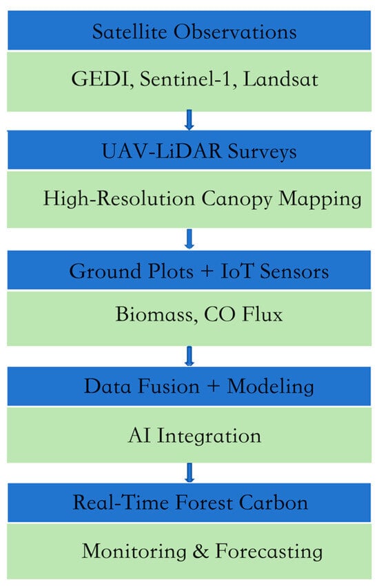 Forest ecosystems store approximately 45% of terrestrial carbon, making accurate monitoring essential for climate mitigation strategies. However, conventional forest carbon assessment methods face three critical limitations: (1) spatial scalability constraints of field measurements, (2) temporal resolution gaps between policy needs and monitoring capabilities, and (3) integration challenges across multiple data sources and modeling approaches. While recent advances in remote sensing technologies have enhanced forest monitoring capabilities, systematic integration of multi-source data remains fragmented. Critical gaps include insufficient comparative analysis of fusion approaches, limited uncertainty quantification frameworks, and inadequate policy–science interface development.